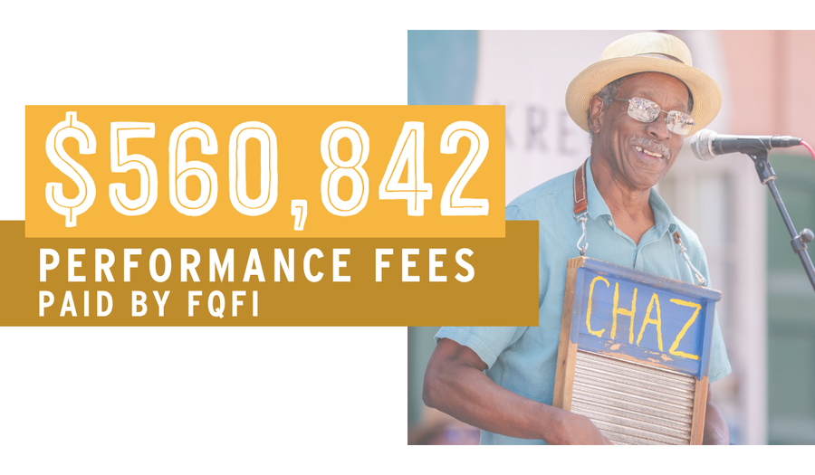 Every musician hired directly by FQFI earned at least $210 per performance, with the average topping $300. Standard minimum rates ensure a more equitable pay structure across genres and stages—so all performers, big or small, are valued for their craft.